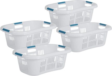 Rubbermaid 4 Pack Small Laundry Basket, 2.1 Bushel Bedroom Hamper, Hip-Hugger Plastic Clothing Bin with Carrying Handles, White