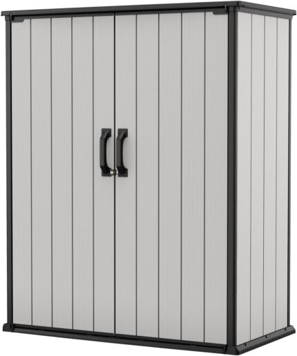 Keter Premier Tall 4.6 x 5.6 ft. Resin Outdoor Storage Shed with Shelving Brackets for Patio Furniture, Pool Accessories, and Bikes, Grey & Black