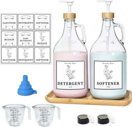 Glass Laundry Detergent Dispenser, Liquid Laundry Soap Dispenser for Laundry Room, 64oz Detergent Bleach Softener Dispenser for Farmhouse Decor, Includes Bamboo Pumps and Tray, Funnel, Labels