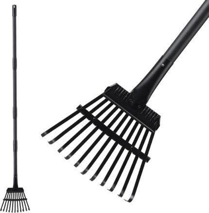 Small Rake for Leaves, 11 Metal Tines Narrow Leaf Rake, 60” Leaf Rakes for Lawns with Adjustable Steel Handle for Camping Flower Beds Mulch Shrub, Black
