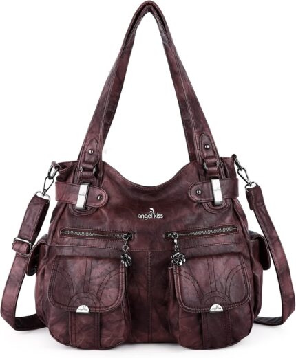 Angel Kiss Women’s Designer Handbag Large Double Zipper Multi Pocket Washed Leather Purse