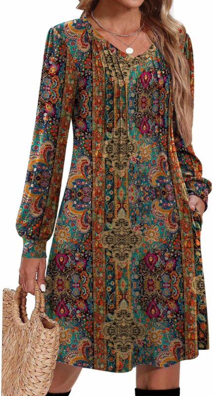 Zeagoo Fall Dresses for Women Long Sleeve Casual Pleated V Neck Dress 2025 A Line Tunic Dress