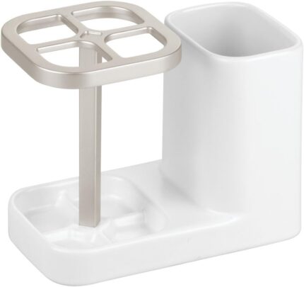 iDesign Sedona Ceramic Toothbrush and Toothpaste Holder for Bathroom Vanity Countertop or Medicine Cabinet -5.75″ x 3.10″ x 4.49″, Satin White/Nickel