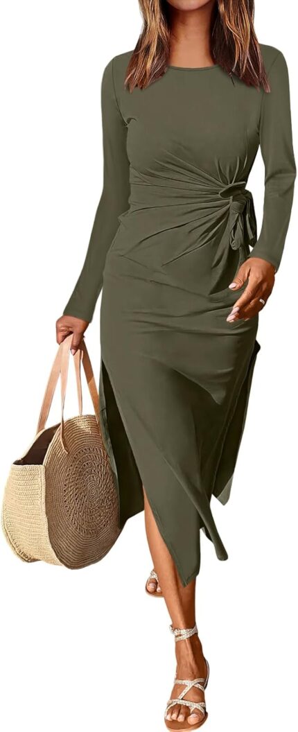 ANRABESS Womens 2025 Fall Long Sleeve Maxi Dress Crewneck Tie Waist Slit Casual Long T Shirt Dresses Winter Trendy Outfits