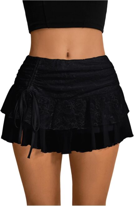 Verdusa Women’s Y2k Lace Ruffle Mini Skirt Mesh High Waist Layered Skirt Skort Boho Outfits Micro Shorts