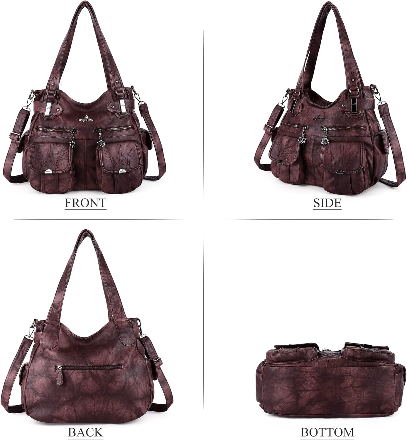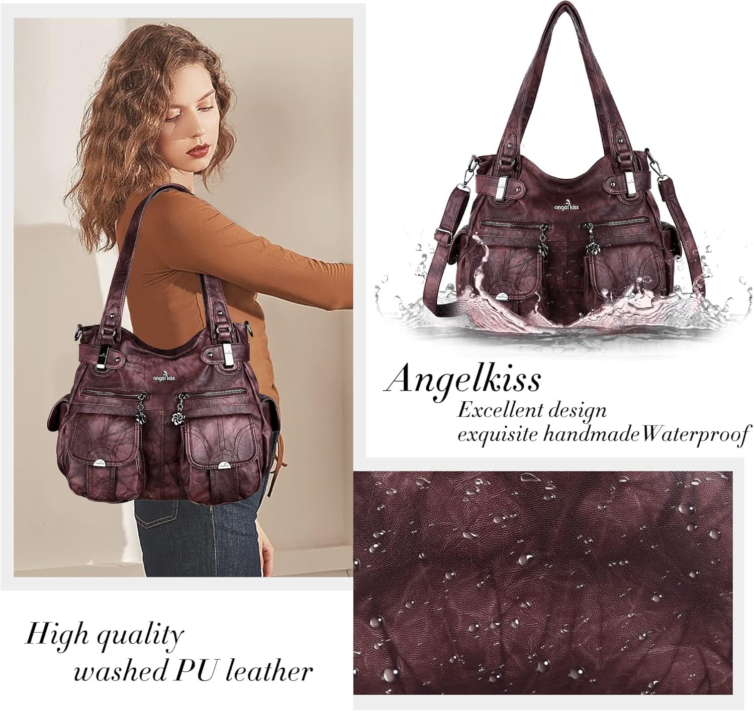Customers appreciate the handbag’s spacious design with lots of pockets, and find it to be a perfect everyday purse that’s large enough to fit a tablet. They like its style, soft leather feel, and color options, particularly the dark purple shade. The durability and zipper quality receive mixed reviews – while the soft leather-like vinyl holds up well to use, some find it flimsy, and while there are plenty of double zipper spaces, some report issues with zippers catching frequently.
