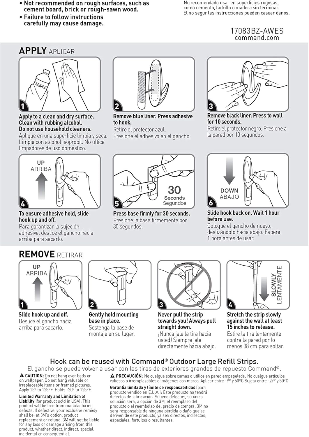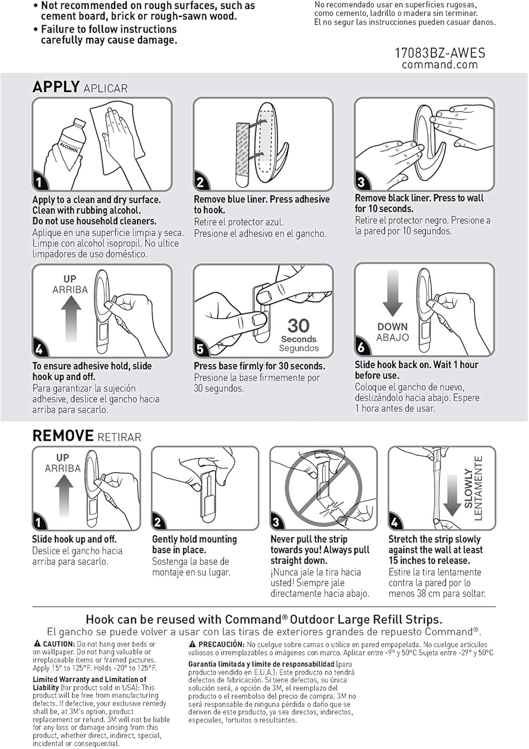 INCLUDES – 3 hooks and 4 large indoor strips; 1 hook holds 5 lbs