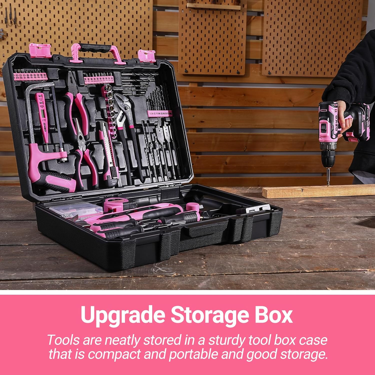 DEKOPRO Pink Drill Tool Kit Set: 20V Cordless Power Drill Tool Box with Battery Electric Drill Driver for Men Home Hand Repair Basic Toolbox Tools Sets Drills Case, DKMT186-GP