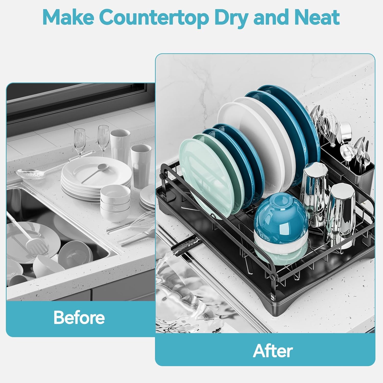 Space-Saving Design: Measuring 16.5″ D x 11.6″ W x 6.6″ H, this compact dish rack is thoughtfully designed to make the most of limited countertop space. It provides organized storage for your daily dishware—plates, bowls, cups, and utensils