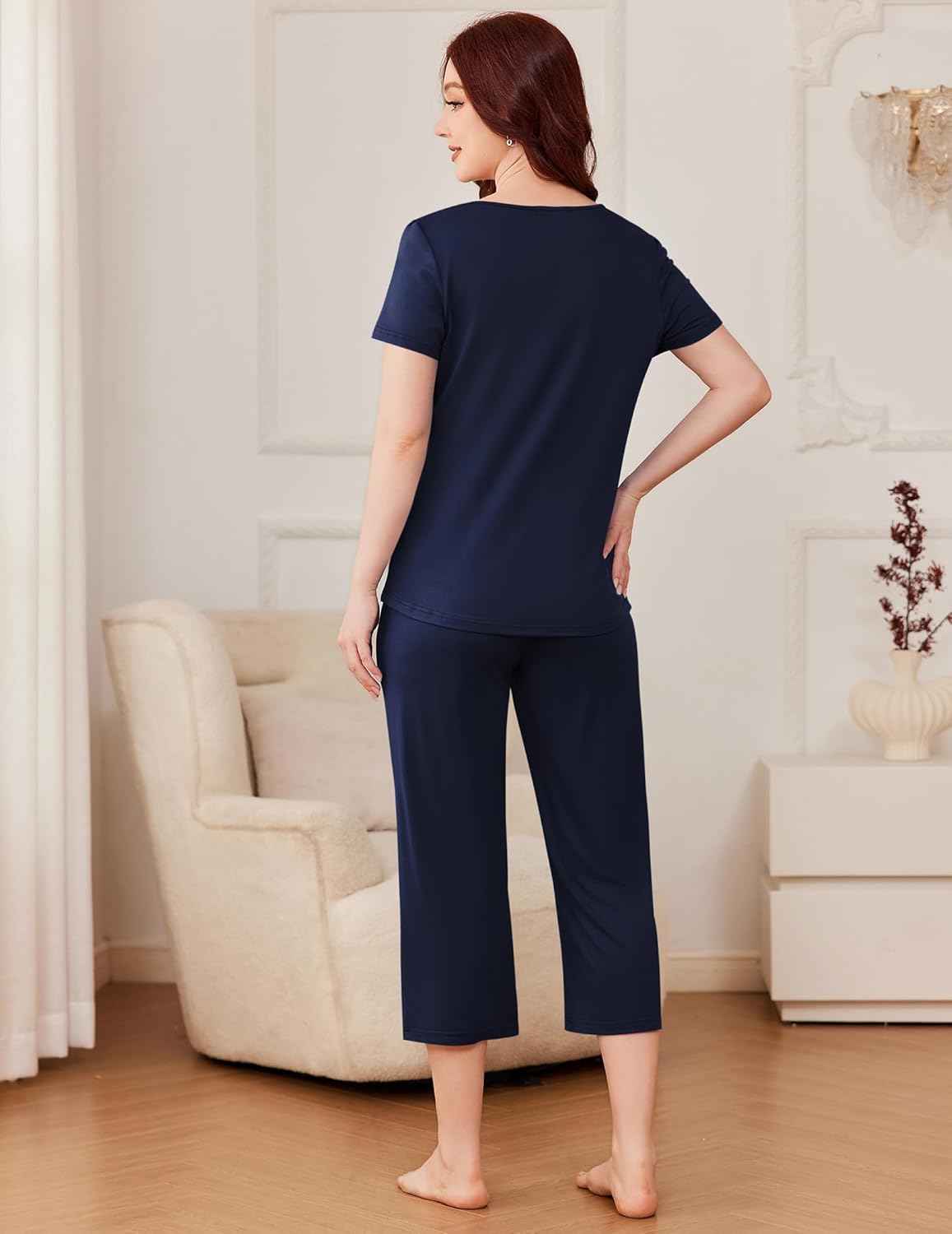 Ekouaer Pajama Set for Women Short Sleeve Top With Capri Pants Pjs 2 Piece O Neck Loungewear Soft Sleepwear with Pockets