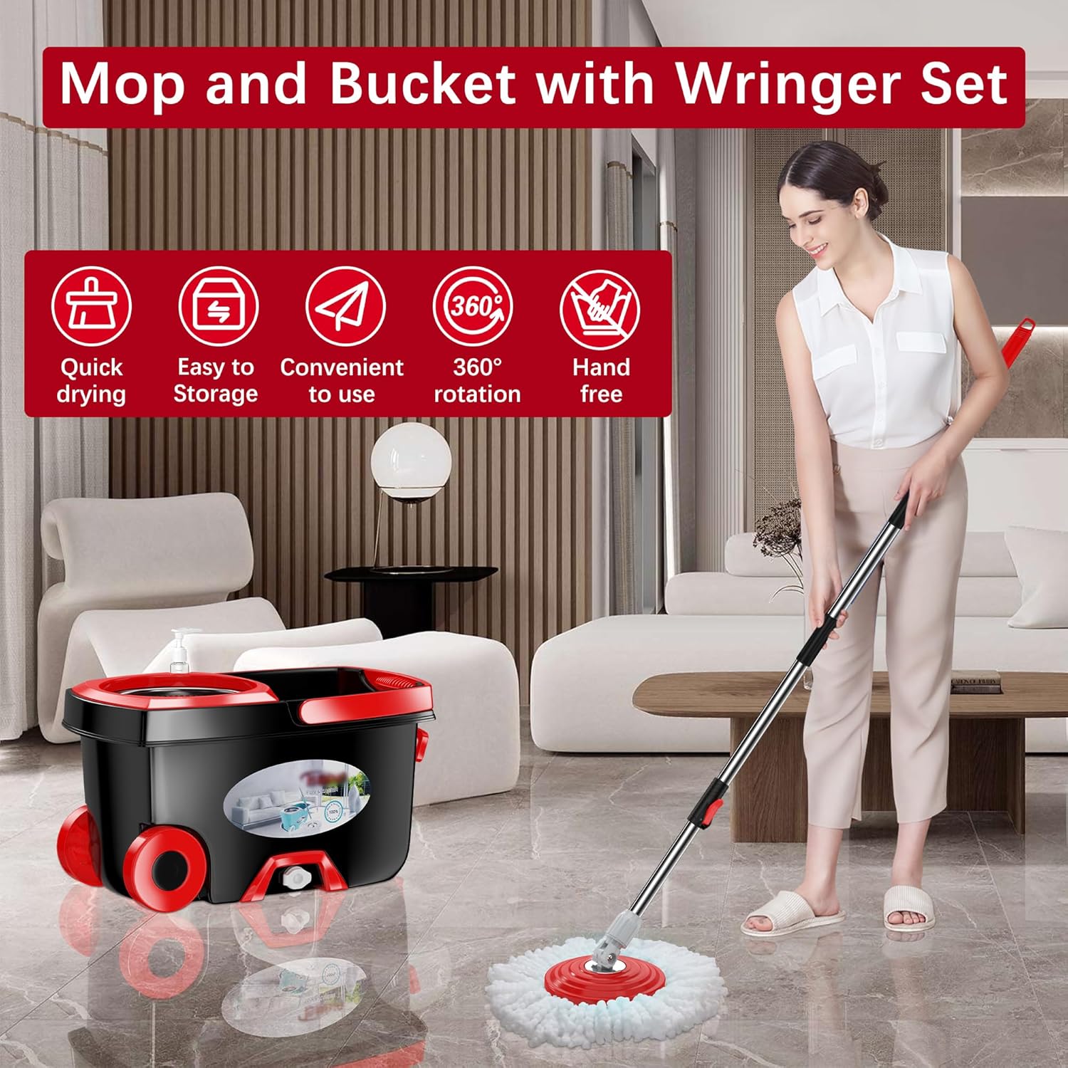 FunClean 360° Spin Mop and Bucket Set with Wringer, 6 Extra Microfiber Heads, 61″ Extended Handle for Effortless Floor Cleaning, 2X Wheel Design – Black