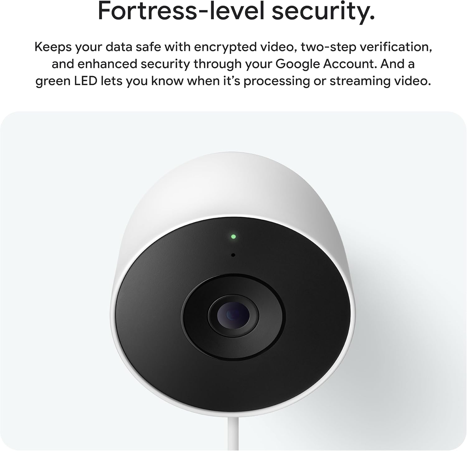 Get more peace of mind with the smarter, sharper wired Nest Cam Outdoor and the intelligence of Google Home. With 2K HDR and Gemini, it provides a crisp, clear picture and more details, summarizes what happened, and lets you search video history simply by asking for something.[1,2,3] LEGAL 1 Compared to earlier Nest Cam models. 2 Availability of 2K resolution is dependent on Wi-Fi and network strength, and requires connectivity speed of at least 3.3Mbps. 3 Requires Google Home Premium Advanced plan (sold separately), Google Home app, Wi-Fi, and internet connection. Features subject to change; available in select countries and languages. Gemini features work independently of Gemini apps. Check responses for accuracy; results may vary. 4 Purchase of Nest Cam Outdoor (wired, 2nd gen) comes with a 1-month trial of Google Home Premium from date of offer redemption. Offer available to users 18 years or older only. New users are eligible for a 1-month trial of the Standard or Advanced plan. Current Standard plan subscribers are eligible for a 1-month trial of the Advanced plan. Offer is not available to current Advanced plan subscribers or users currently in a free trial of Google Home Premium. Redeem offer during device setup in the Google Home app or redeem in Settings in the Google Home app or on the Google Store Subscriptions page after device setup. Valid form of payment and Google Account required at signup. Subscription auto-renews, unless previously cancelled, after expiration of trial membership at $10/month or $100/year for Standard plan or $20/month or $200/year for Advanced plan. Cancel anytime. One trial per home at a time. Return of purchased device may result in cancellation of subscription. No refunds for partial billing periods are available, except as required by applicable law. See g.co/nest/tos for full terms. 5 Some features, including mobile and browser notifications, remote control, video recording, video streaming and video history, require the Google Home app and working internet and Wi-Fi. 6 Familiar face alerts require Google Home Premium subscription, working Internet and Wi-Fi. Not available in Nest Cams used in Illinois. 7 Requires Google Home Premium subscription (sold separately), Google Home app, Wi-Fi, and internet connection. Features subject to change; available in select countries and languages. Gemini features work independently of Gemini apps. Check responses for accuracy; results may vary. 8 Home Automations may require additional enrollment and setup, and depend on working internet, Wi-Fi and service availability for compatible smart home devices (sold separately) included in the automations. 9 Resolution is dependent on Wi-Fi and network strength, and requires connectivity speed of at least 2Mbps. 10 Garage door detection requires Google Home Premium Advanced plan (sold separately, working internet and Wi-Fi and is only available in US and Canada with Nest Cam (indoor, wired, 2nd & 3 gen) and Nest Cam (indoor or outdoor, battery) when wired. 11 Early access to Gemini Live is available to select, existing US Google Home Premium subscribers with compatible speakers and displays beginning 10/28, and will gradually rollout to all Google Home Premium subscribers by early 2026. 12 Power cable sold separately. 13 Requires Google Home Premium Advanced plan (sold separately). 14 Nest Cam Outdoor is designed to comply with protection rating IP65 under IEC standard 60529 when the device leaves the factory, offering resistance against water and dust but is not waterproof. Water and dust resistance are not permanent conditions and decrease or are lost over time due to normal wear and tear, device repair, disassembly, or damage.