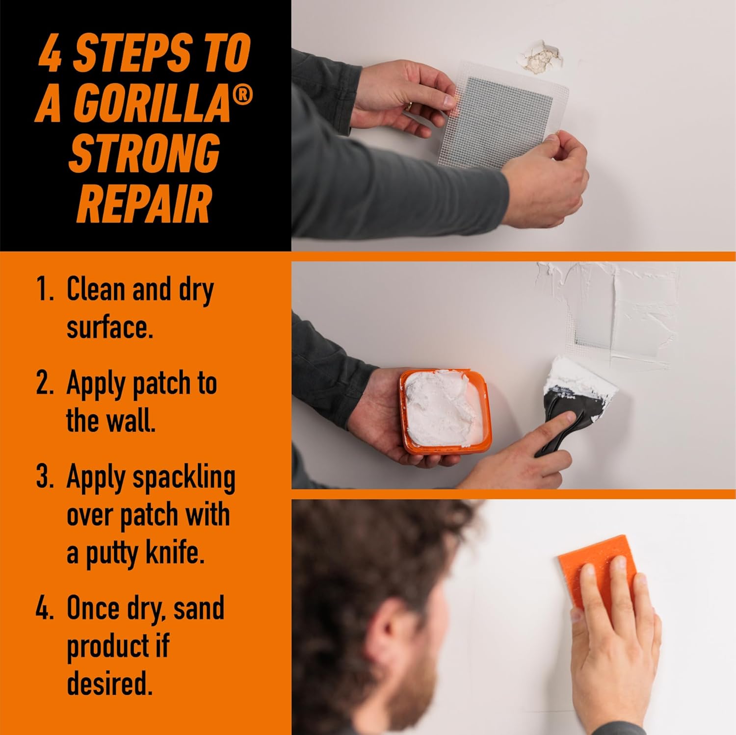 Gorilla Heavy Duty Wall Repair Spackling + Primer is the go- to product for strong, durable repairs on walls, ceilings, cracks and both small and large holes. The lightweight formula is easy to spread, easy to control and doesn’t sag, shrink or crack. Gorilla Wall Repair’s smooth finish does not require sanding and paints like drywall for a professional looking finished project!