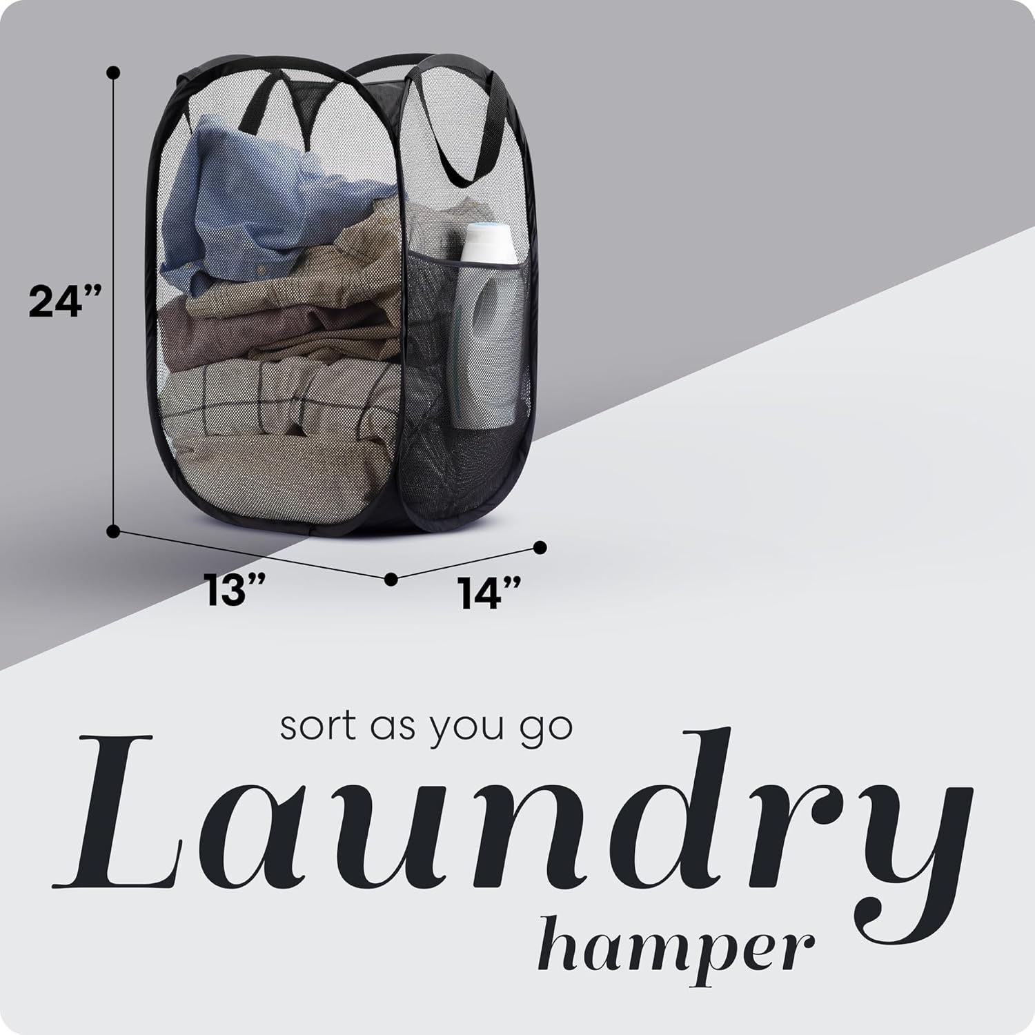 Handy Laundry Collapsible Mesh Pop Up Hamper with Wide Opening and Side Pocket – Breathable, Sturdy, Foldable, and Space-Saving Design for Clothes and Storage (Black)
