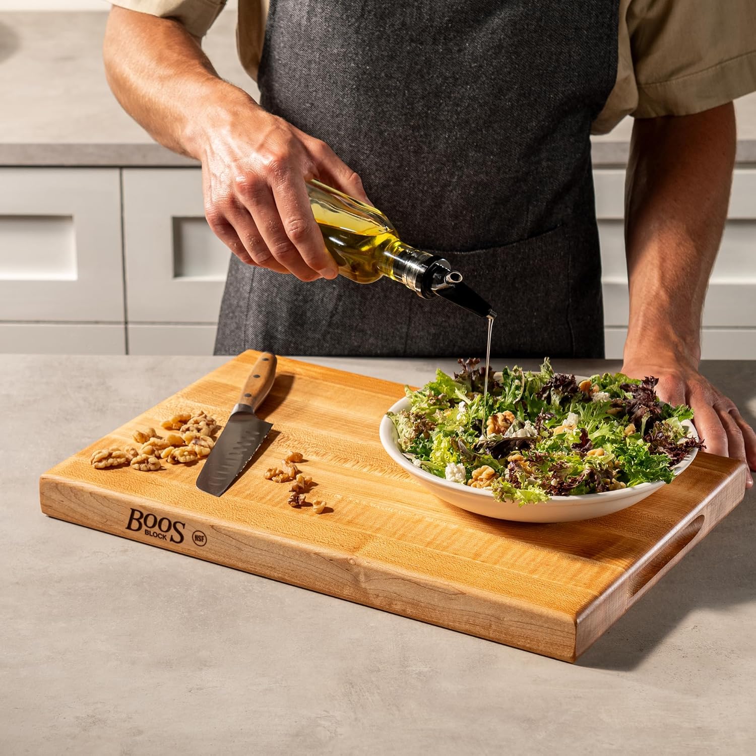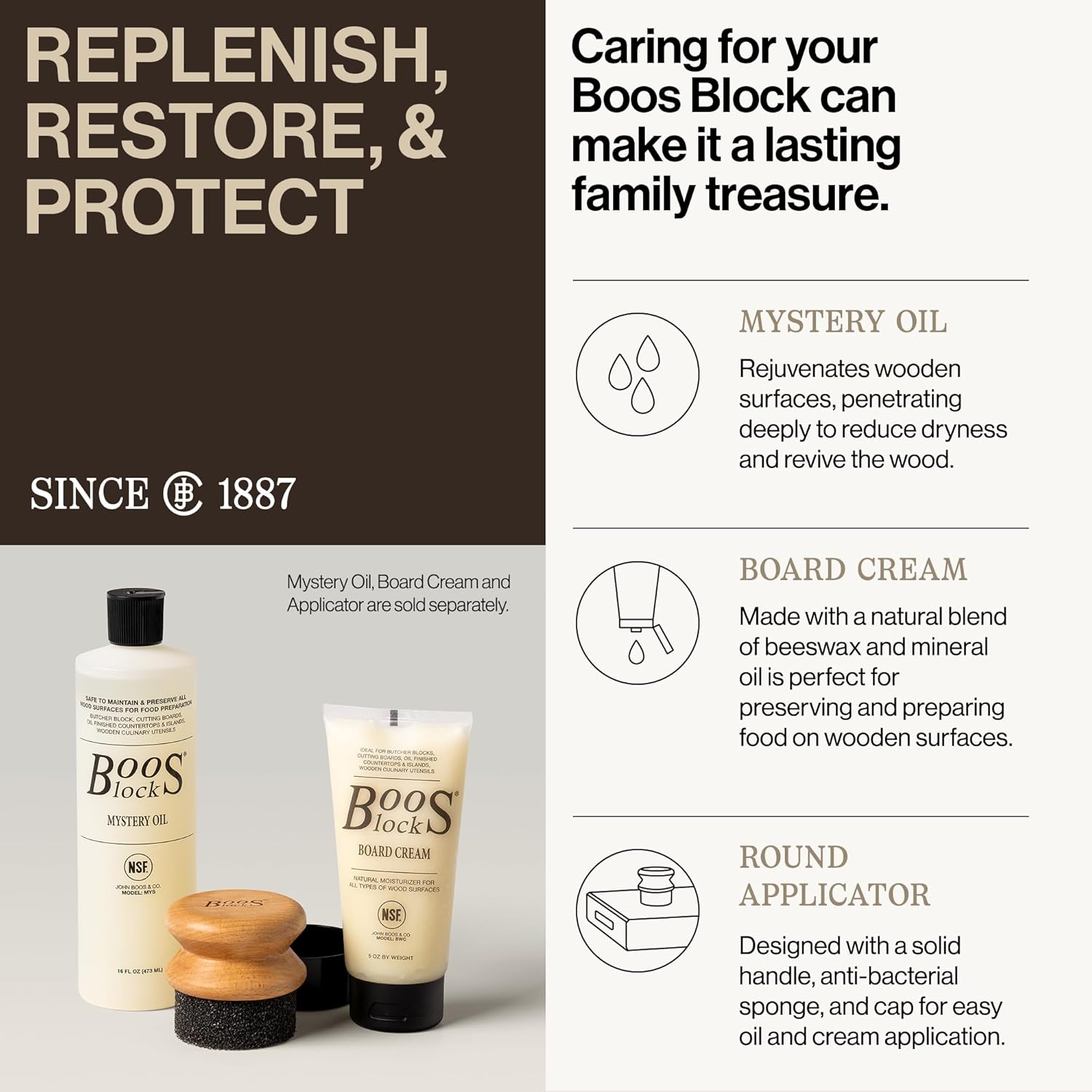 Easy Care: Hand-wash only. Use our Boos Block Mystery Oil and Board Cream (sold separately) to preserve the natural beauty of the wooden board surface and fibers. Refer to our care guide for details.