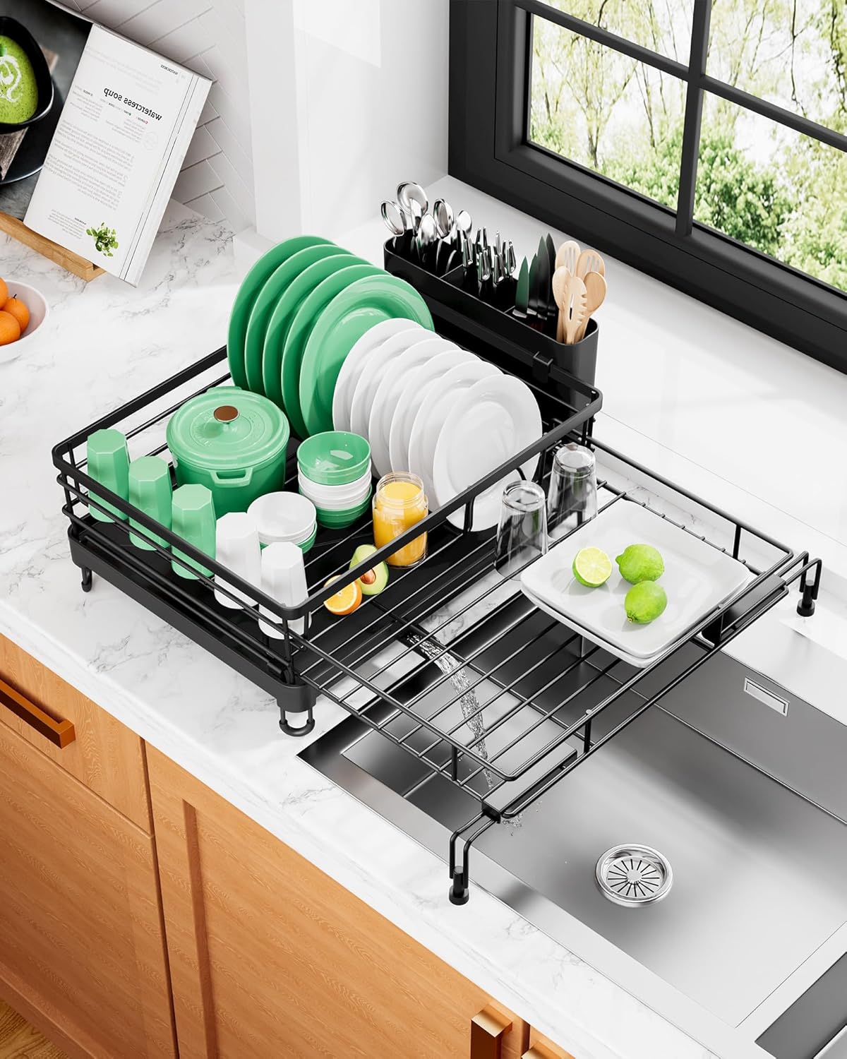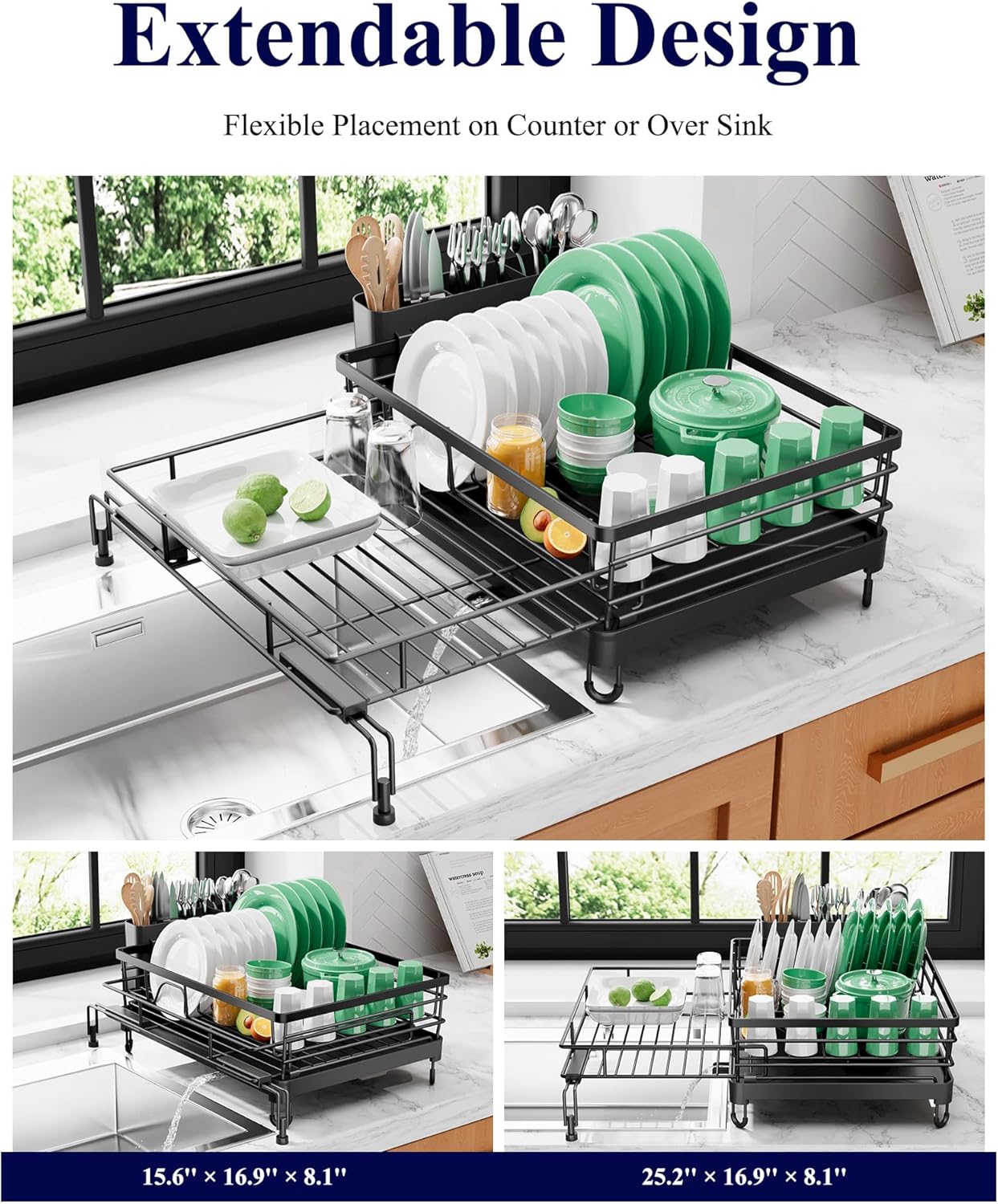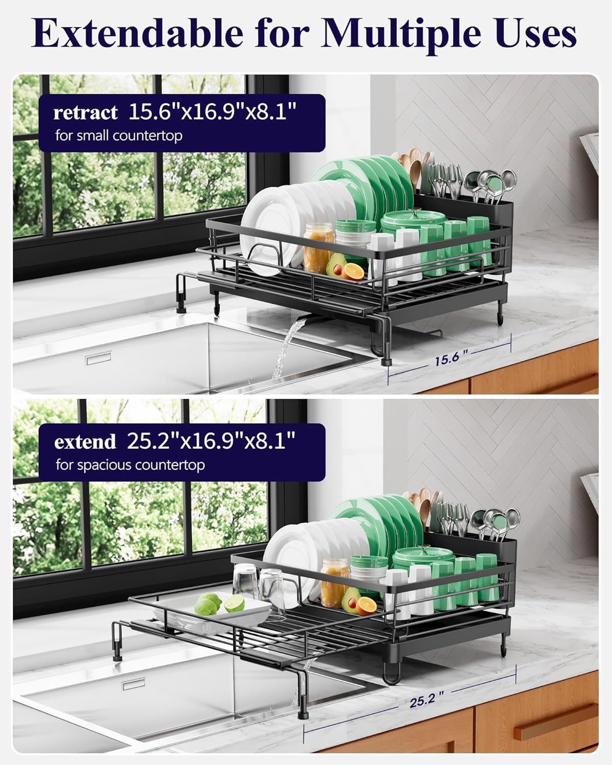 FLEXIBLE SIZE & CAPACITY: This kitchen dish drying rack is 15.6” in length and extends to 25.2” (16.9”W×8.1”H) to fit over the sink or counter without worrying about size. Its extendable design adapts to different kitchens and provides extra space for dishes, bowls, and utensils. This allows you to handle everyday meals and family gatherings efficiently while keeping your kitchen organized.