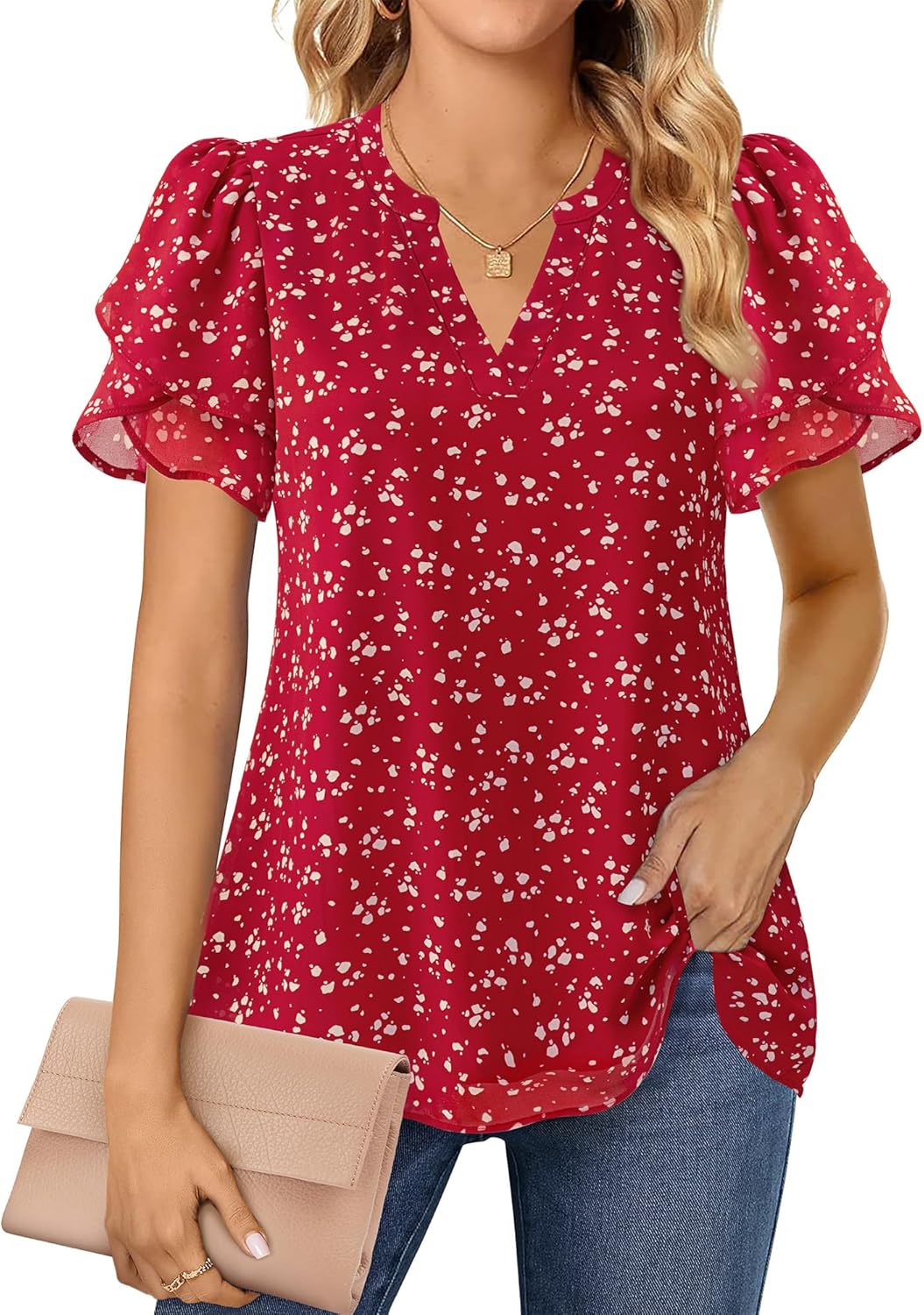 Lotusmile Womens Dressy Chiffon Blouses Summer Puff Petal Short Sleeve Shirts V Neck Casual Work Tops