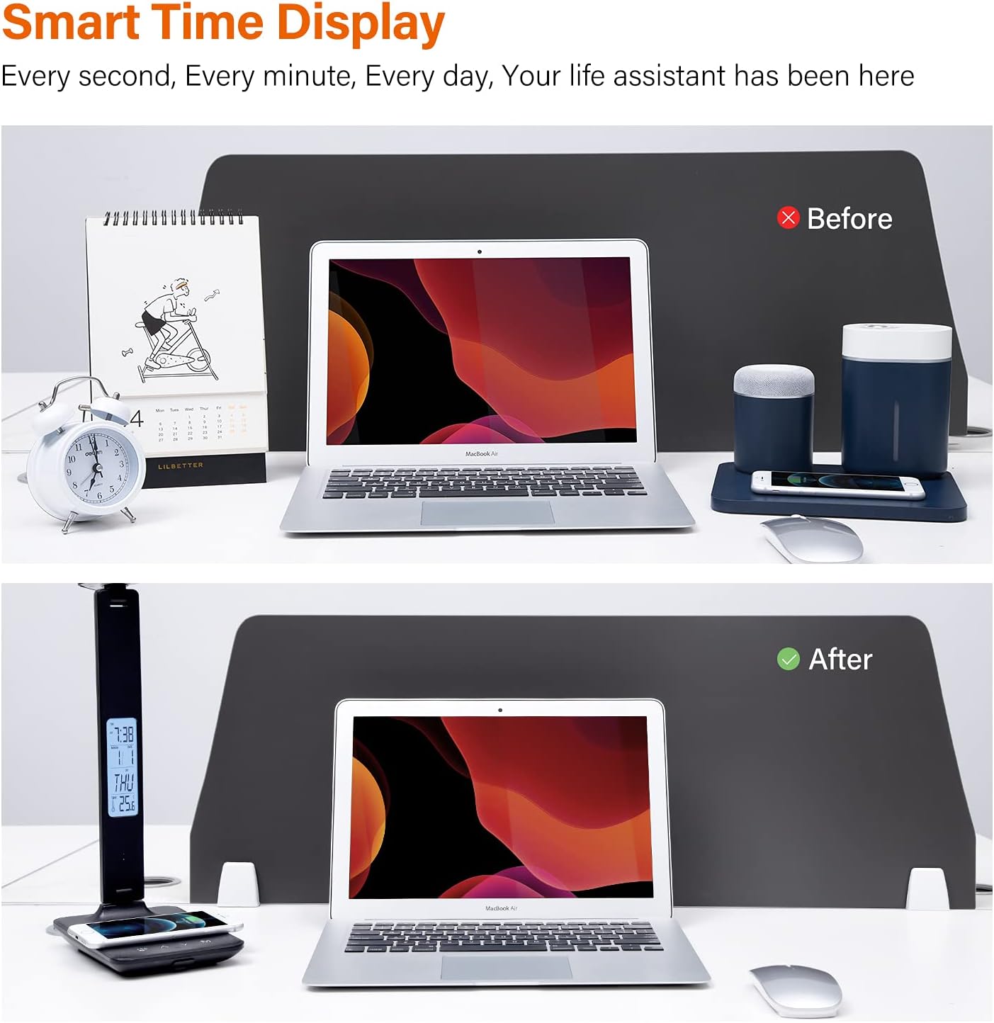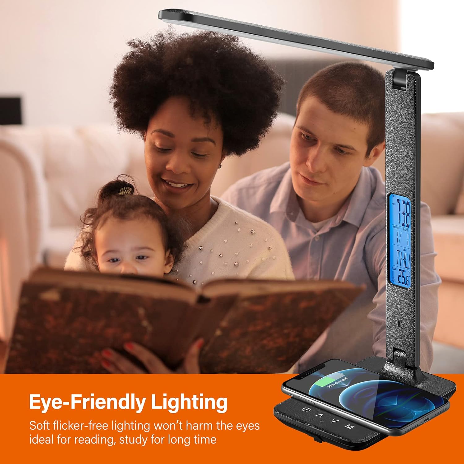 poukaran LED Desk Lamp with Wireless Charger, USB Charging Port, Table Lamp with Clock, Alarm, Date, Temperature, Desk Lamps for Home Office,Black