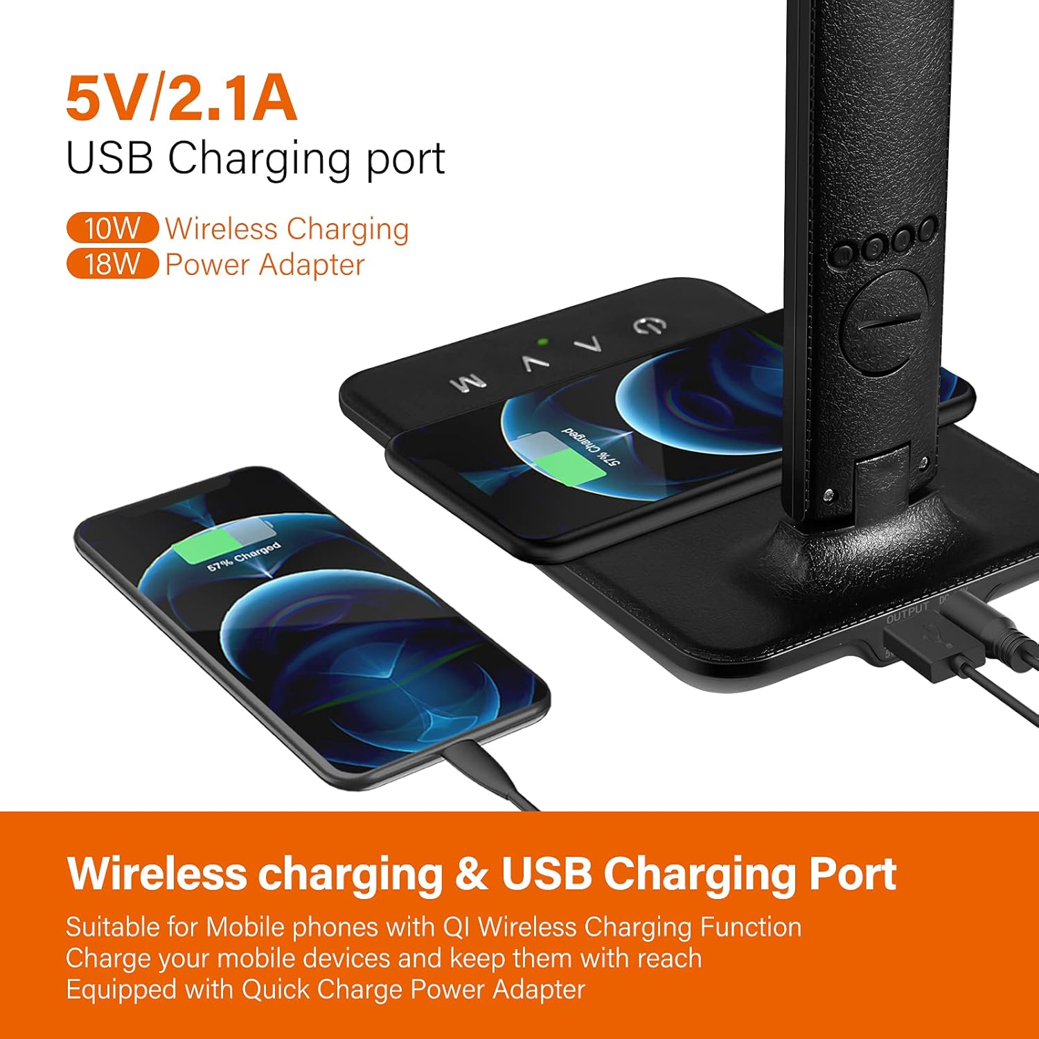 POWERFUL CHARGING: Owning both USB charging port and fast wireless charger (needs 5V/2A adapter, already Included) Which means you can charge two devices and use the desk lamp to work at the same time.