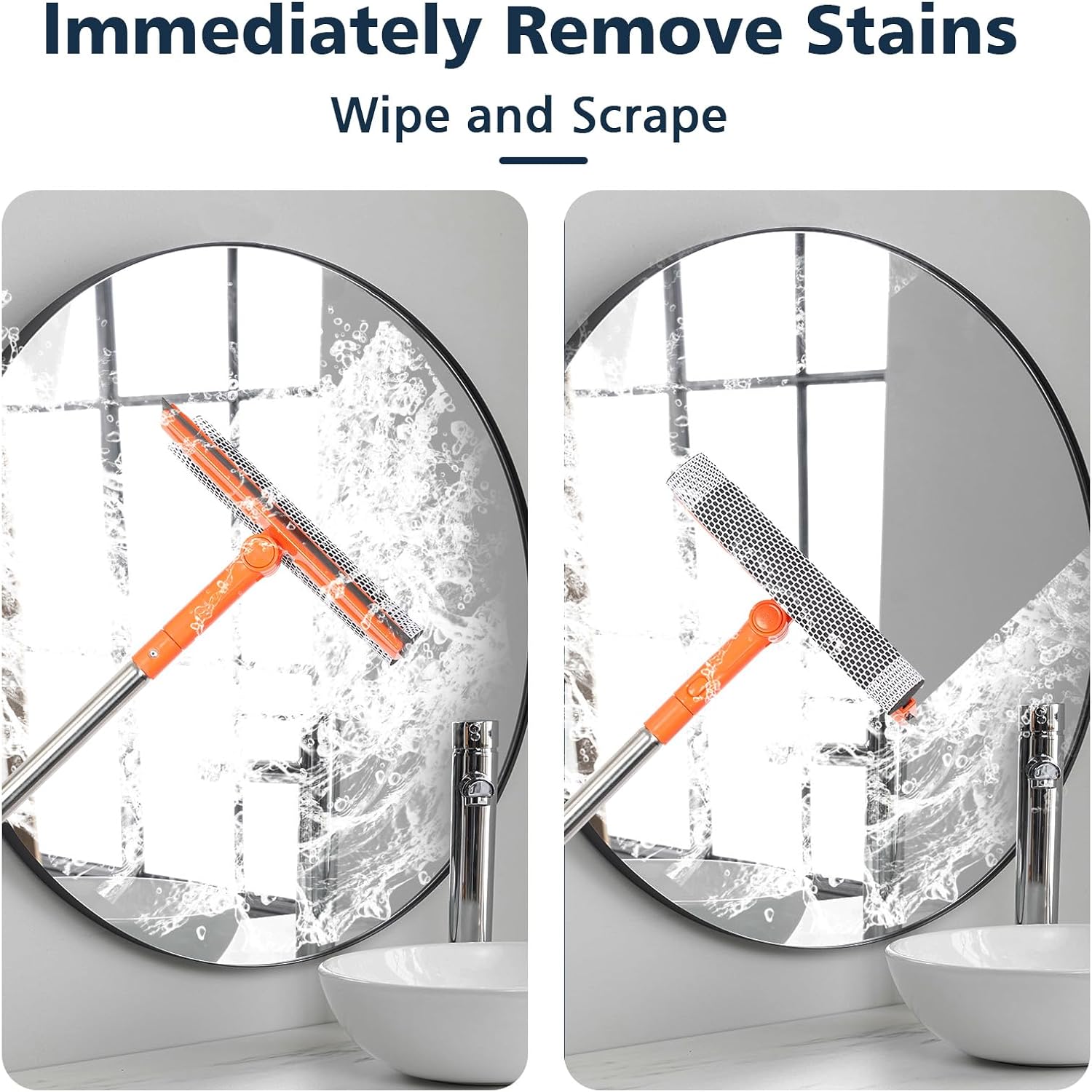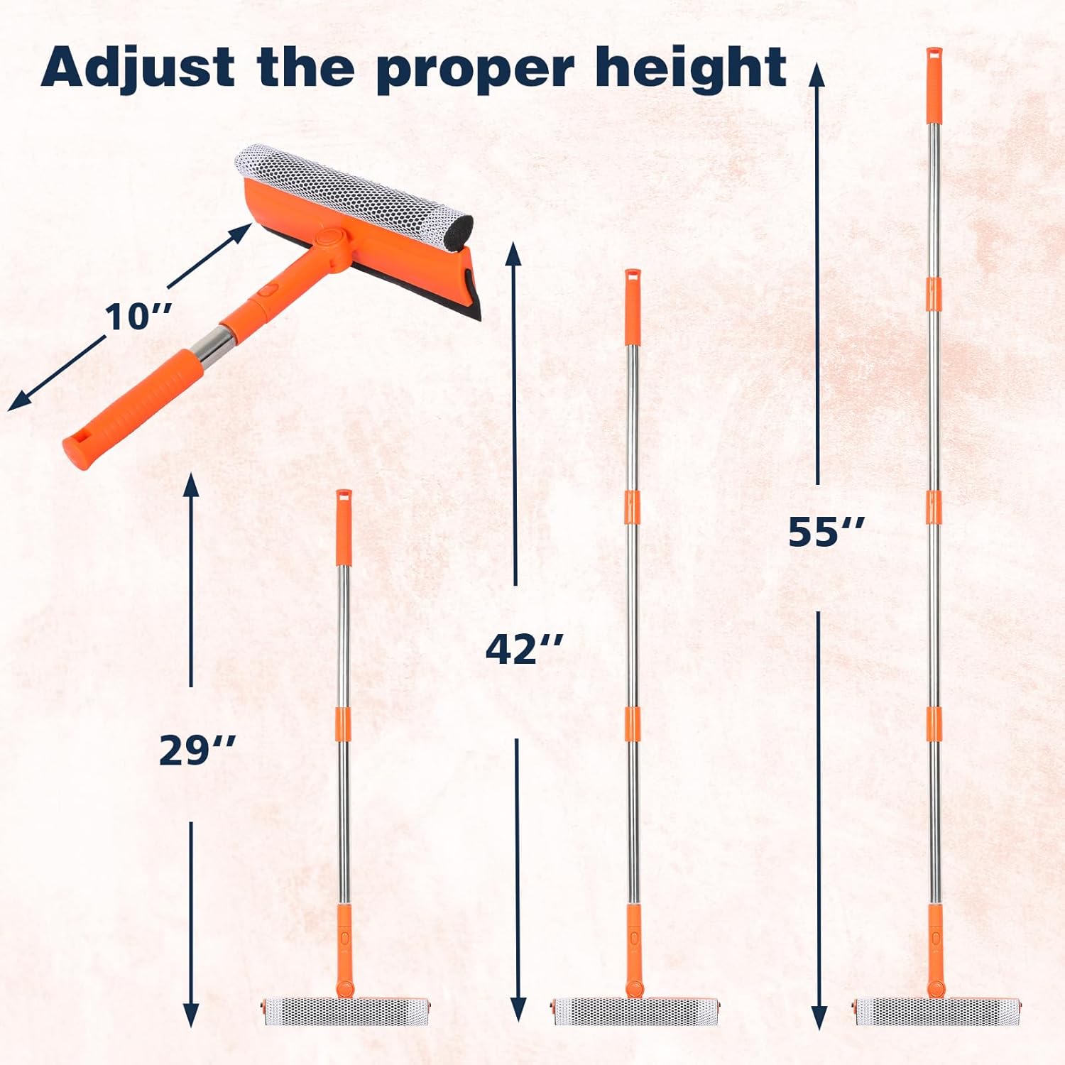 【Cost Performance Selectionl】:The 2 in 1 window squeegee is 10 inches and the length of the pole can reach up to 55 inches (4 section of handles), you can clean high windows.Package include 1 super absorbent sponge scrubber with mesh and natural rubber squeegee,four section of extension handles.