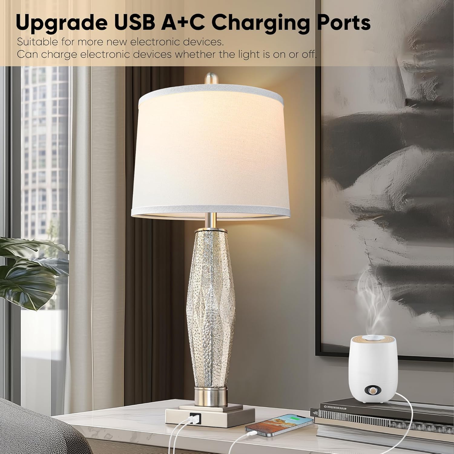 QiMH Table Lamps Set of 2, Bedroom Lamp with USB A+C Charging Ports, Modern Beside Lamps for Living Room with White Shade Rotary Switches, Glass Nightstand Lamp Home Decor (LED Bulbs Included)
