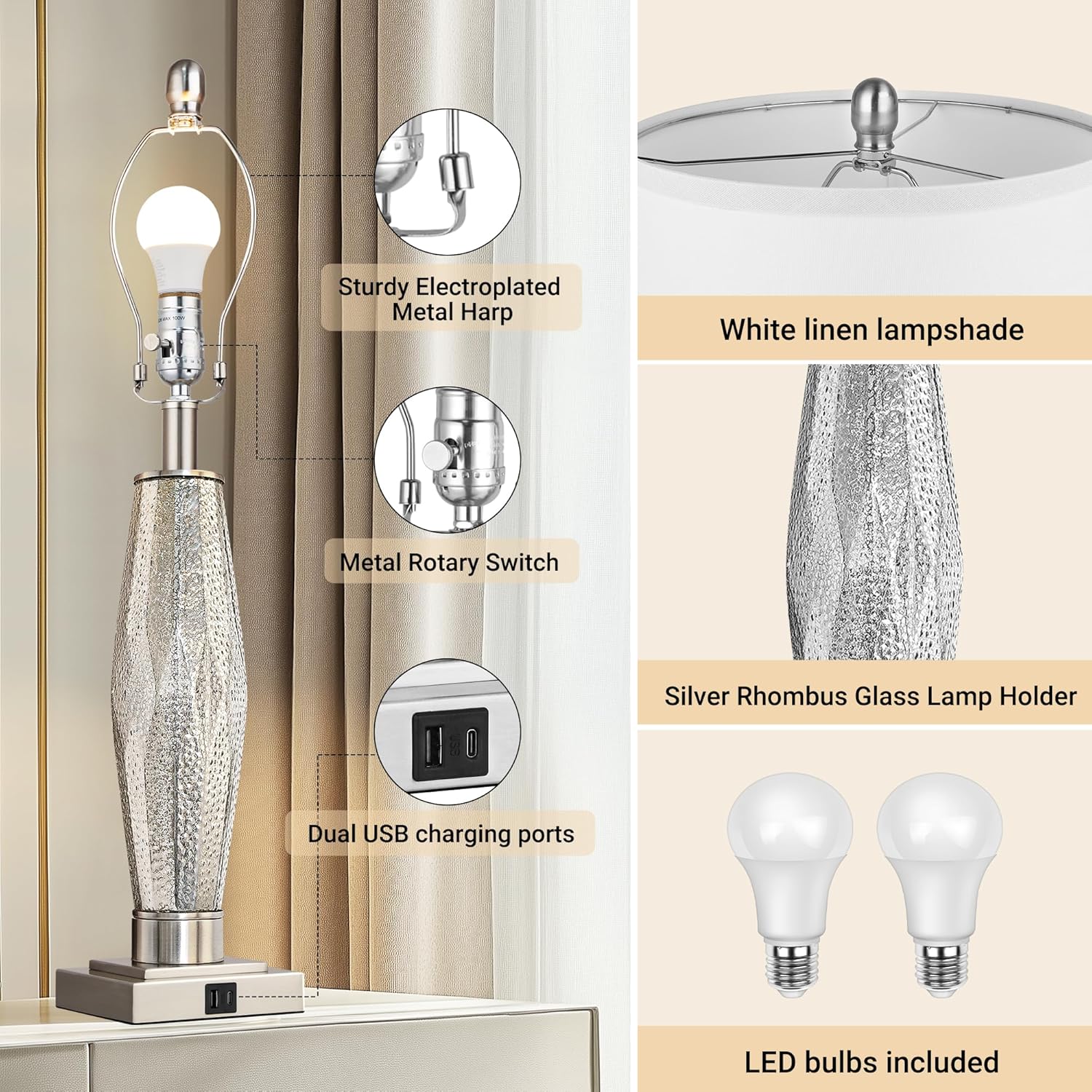 【Elegant Tall Table Lamp】: This stunning lamp features glass and brushed nickel metal lamp base. The symmetrical rhombus pattern sits on glass. The bump finish rich the look for a cohesive design. Up top is the flared drum shade that diffuses the soft light, and matching harp and finial complete the look. Add a contemporary feel to any room with these attractive lamps. The lamp for bedroom is an ideal pick for your entryway console table, bedroom and living room accent cabinet.
