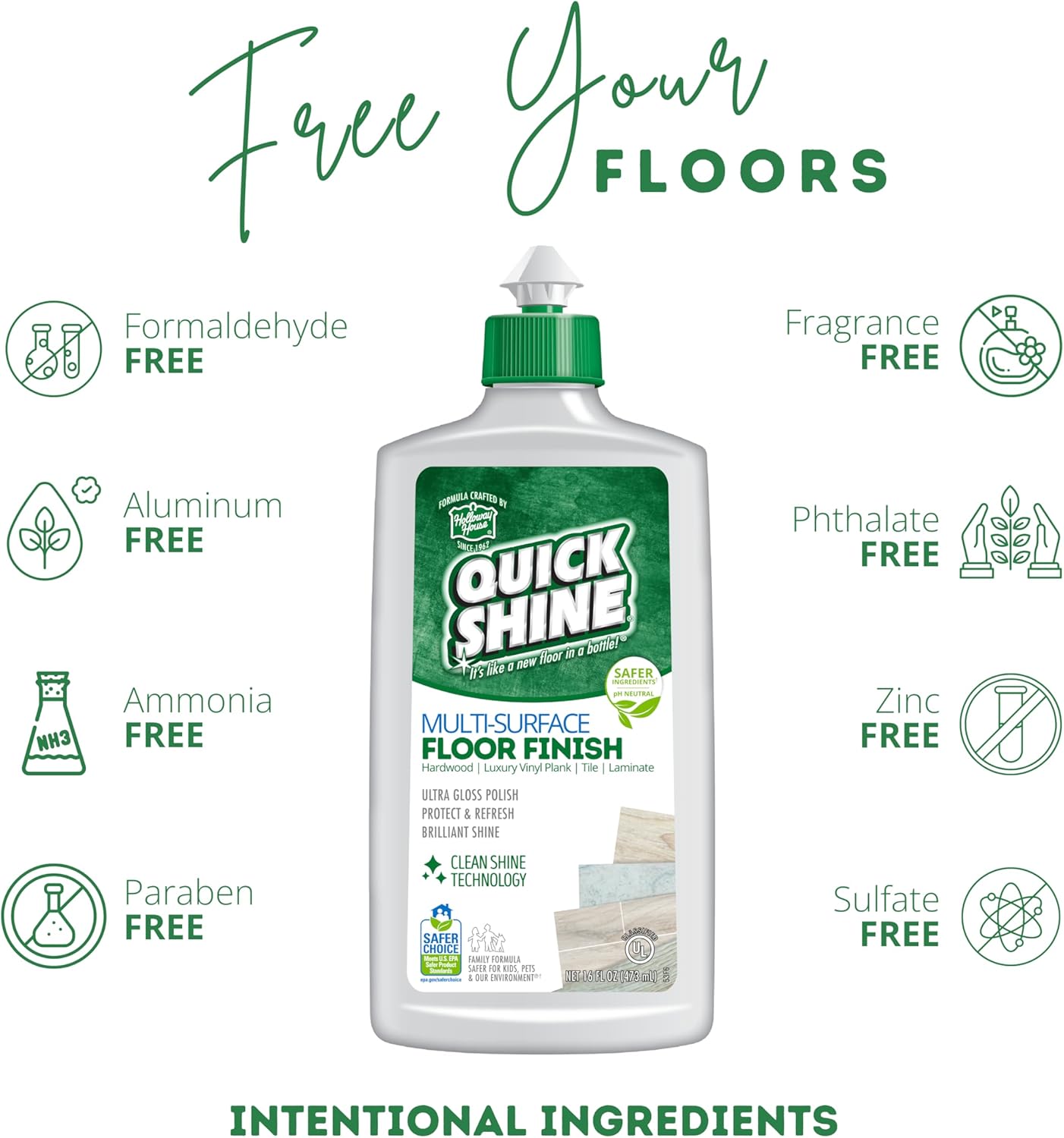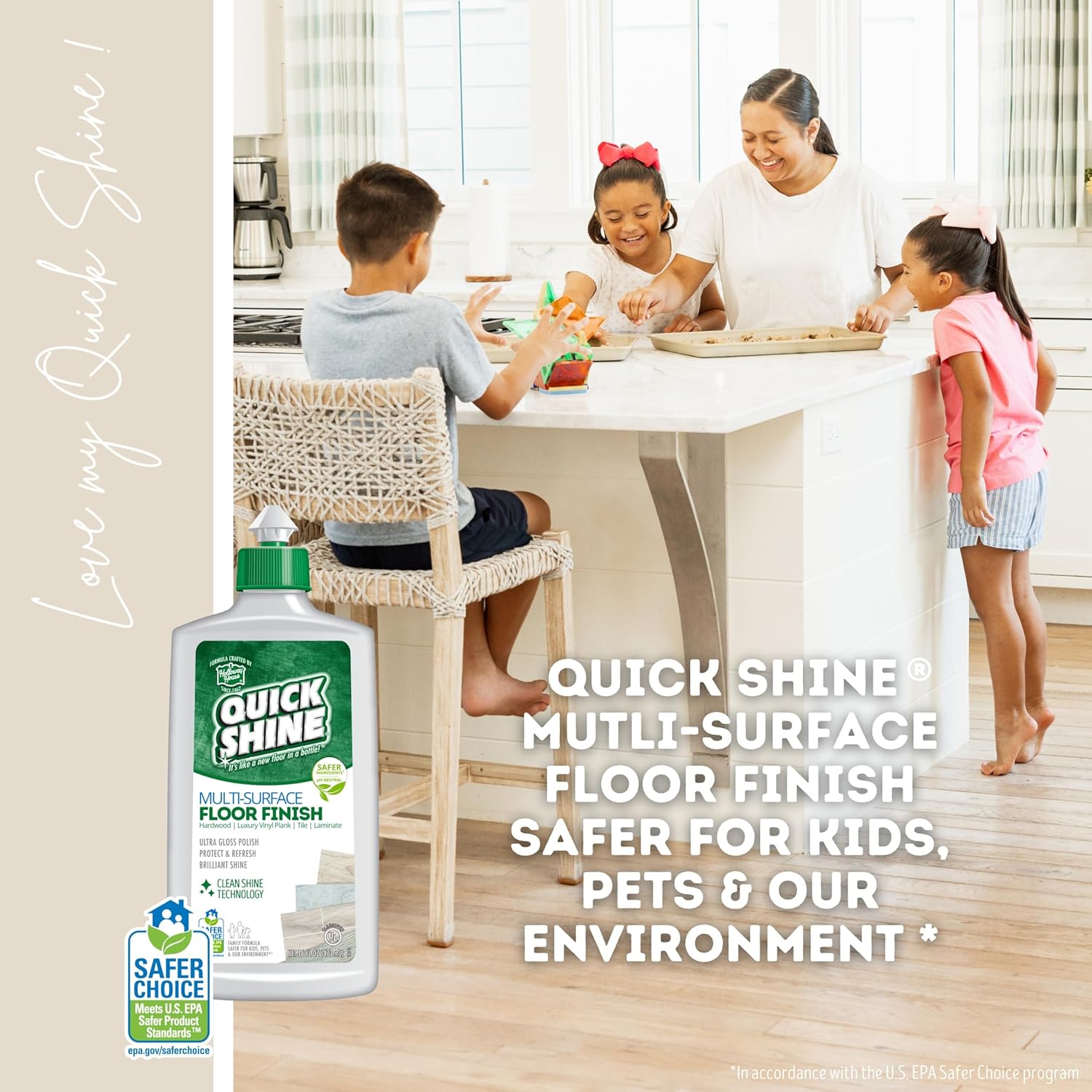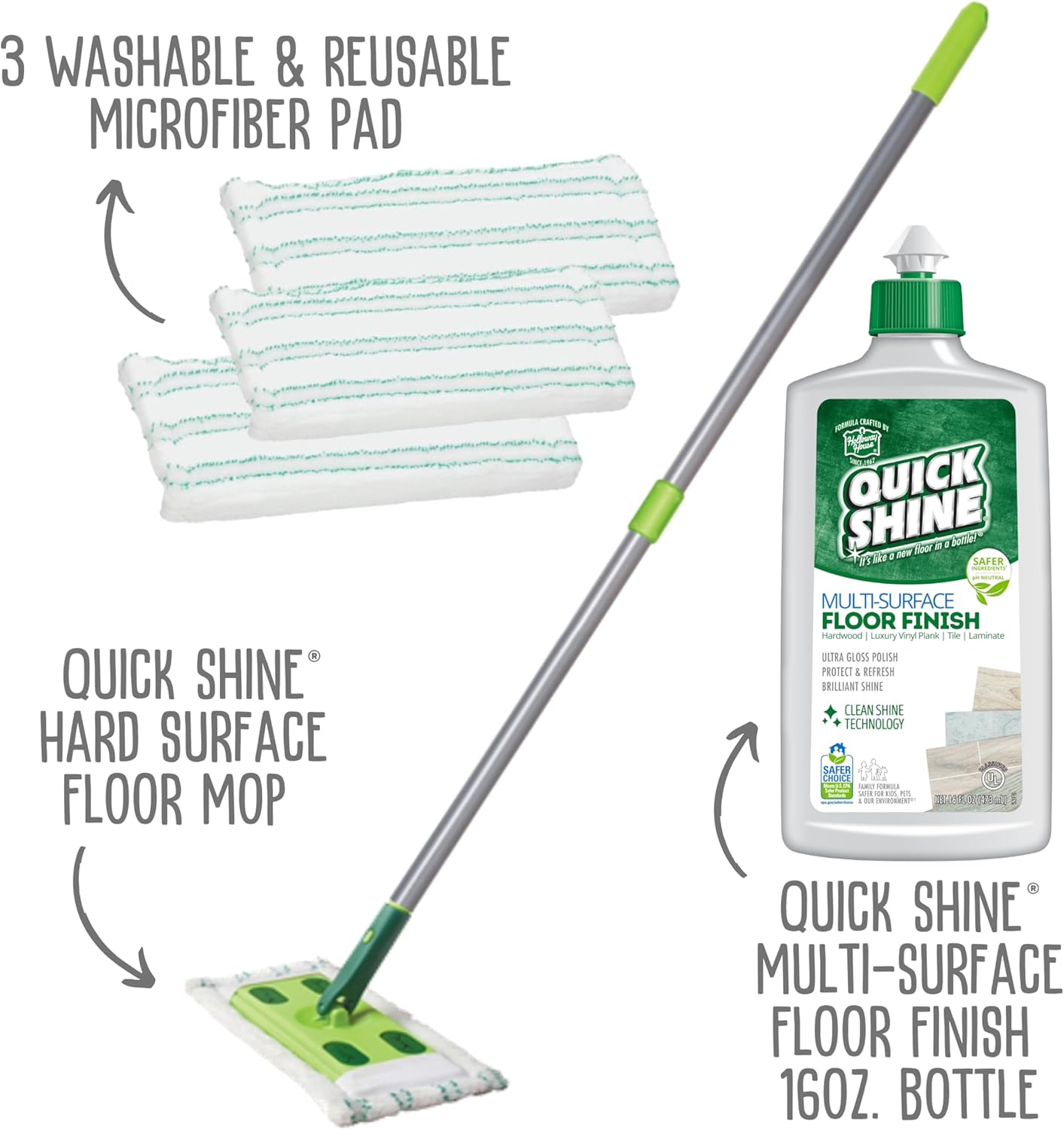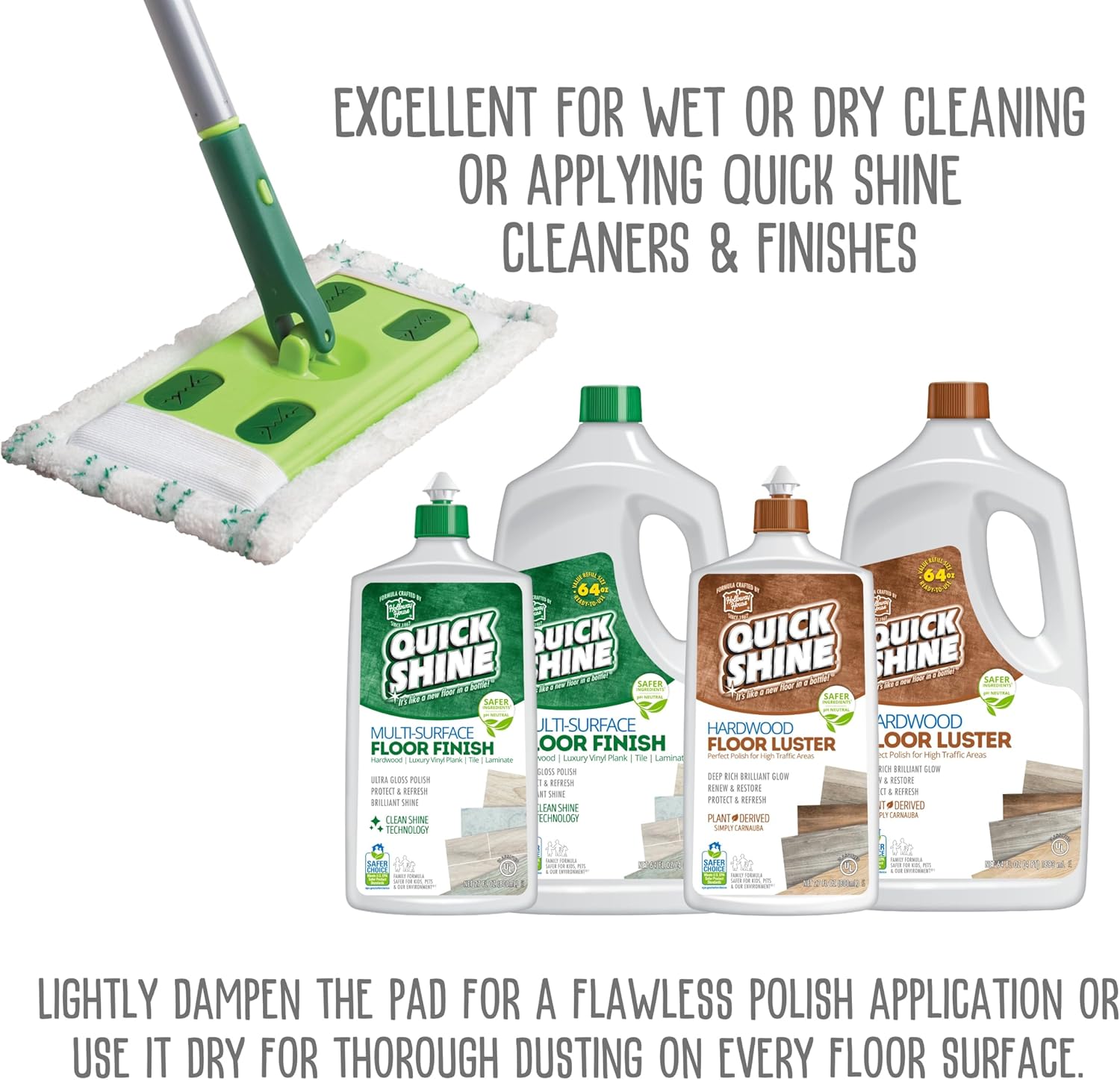 Quick Shine Multi Surface Floor Clean + Polish Mop Kit w/ 3 Reusable Pads & 1-16 oz. Floor Finish | Use Wet + Dry | Hardwood, Luxury Vinyl Plank, Laminate | Safer Choice pH Neutral Formula