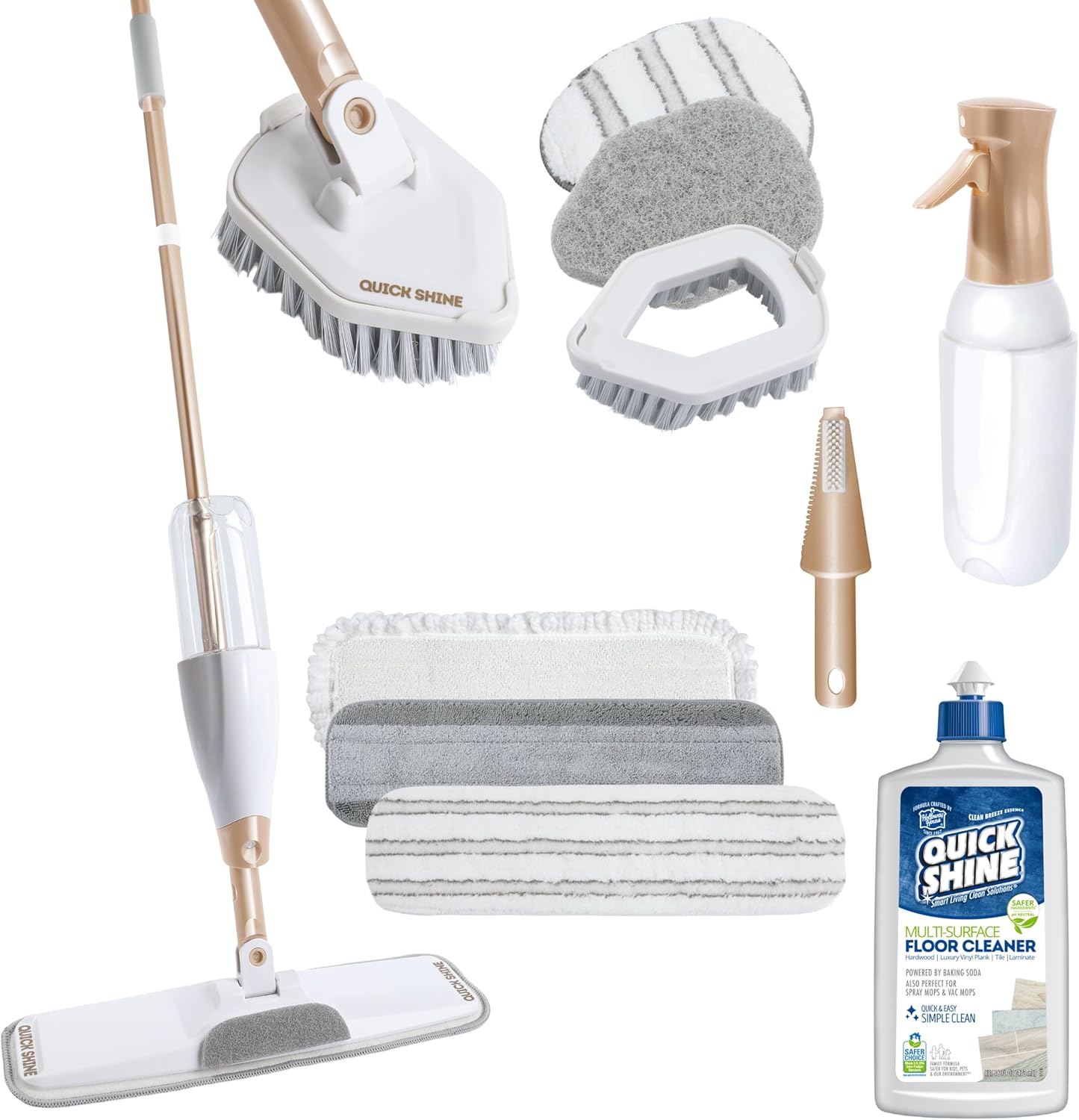 Quick Shine Ultimate Gold Spray Mop Kit | All-in-One 11 Pc Kit w/ Interchangeable Attachments | Floor Cleaner Included | No Batteries Needed | Pro Cleaning System for All Floor Types | 2-in-1 Mop