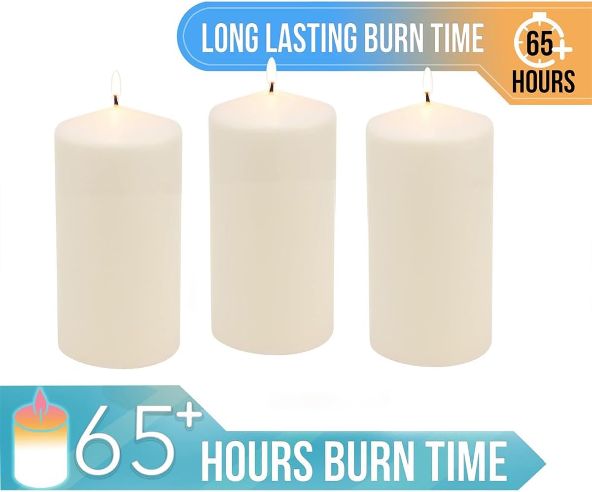 These 3×6 pillar candles are the perfect size for large and medium candle lanterns, glass hurricanes, centerpieces, fireplace, and mantel decorations