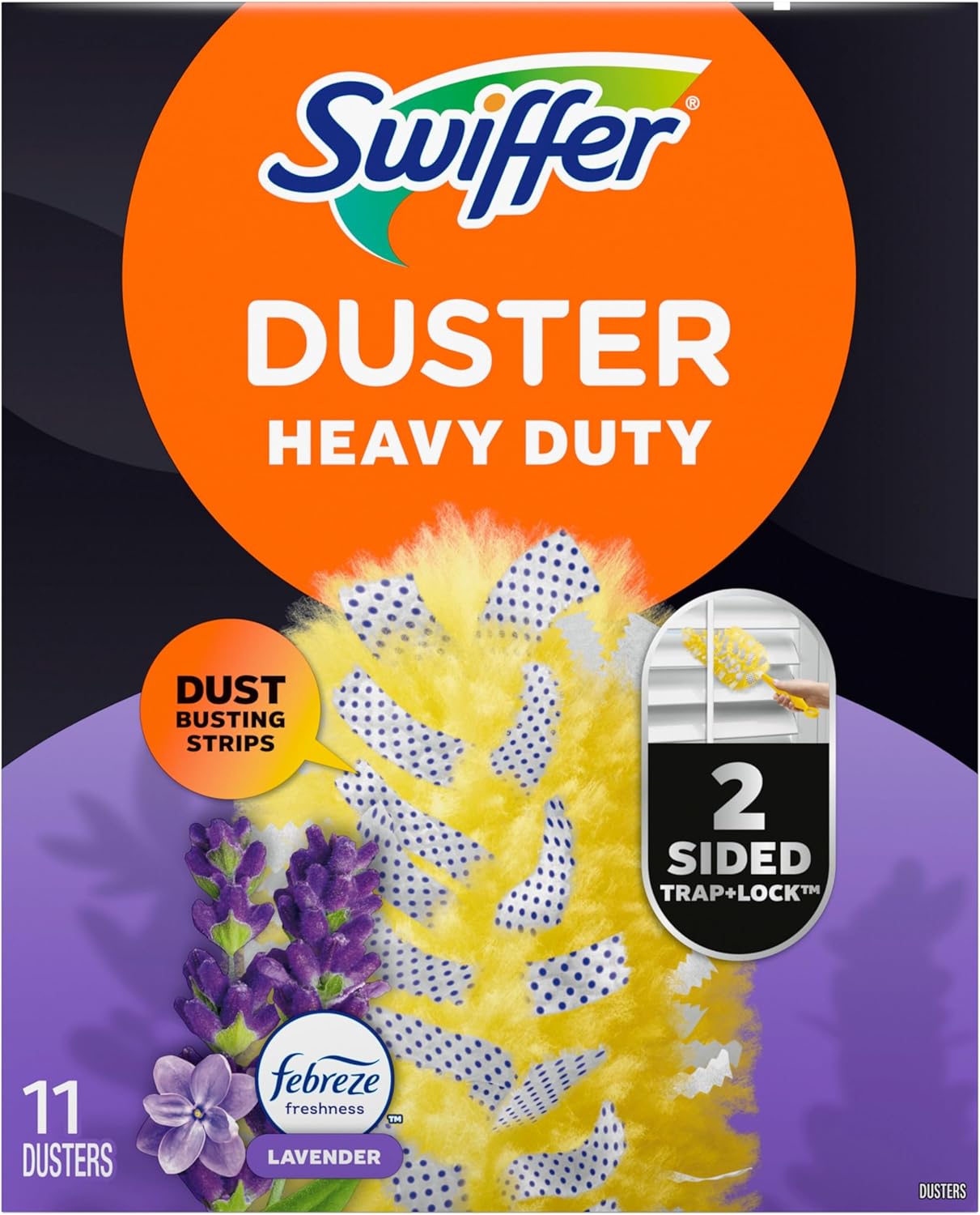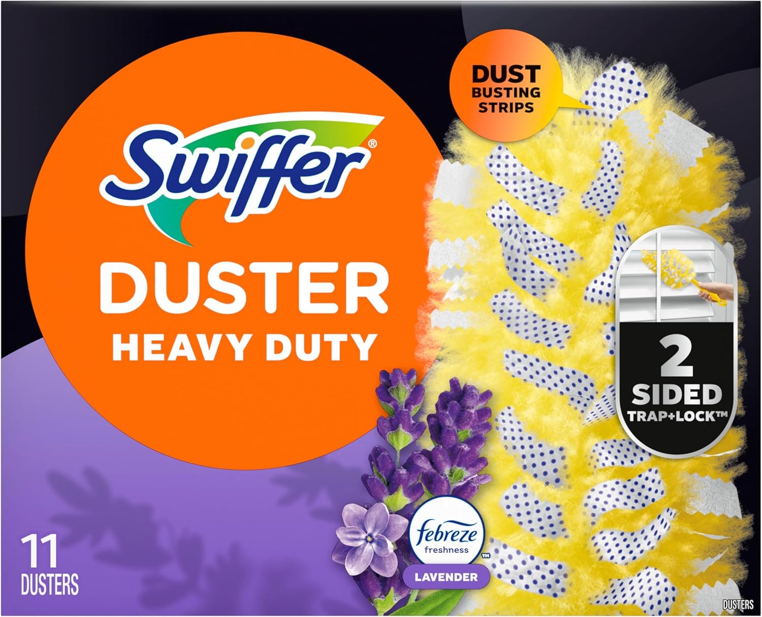 Swiffer Heavy Duty Dusters Trap & Lock Dust & Allergens* in every room. Enjoy the scent of lavender with freshness that lasts up to 1 hour after initial product use. And, with thousands of fluffy, specially-coated fibers and a 360° design, they grab onto dust in every direction and don’t let it go. Use Swiffer Dusters for cleaning wherever dust shows up, including fan blades, blinds, car interior, keyboard vents, bookcases and more. *Common inanimate allergens from cat and dog dander