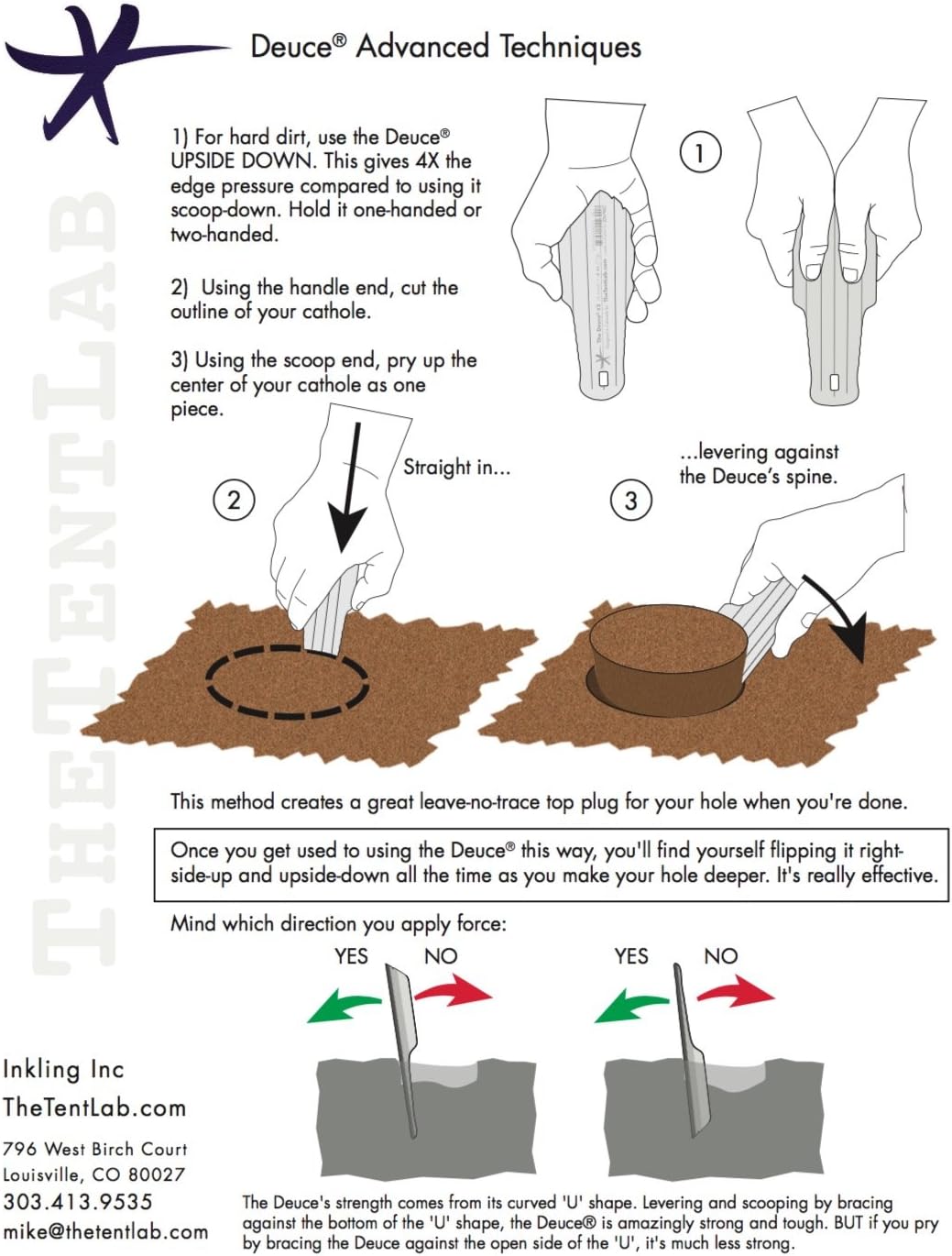 First, save yourself a ton of time and use the Deuce UPSIDE-DOWN to probe the top 3-4” for rocks or roots that might spoil your poop-hole location; probing like this is a fantastic and unique feature of the Deuce; right-side-up, the scoop is large enough to quickly remove dirt; further into the hole, use it upside-down again to break up hard dirt and pry out rocks; it provides up to a 4x increase in digging power when used this way