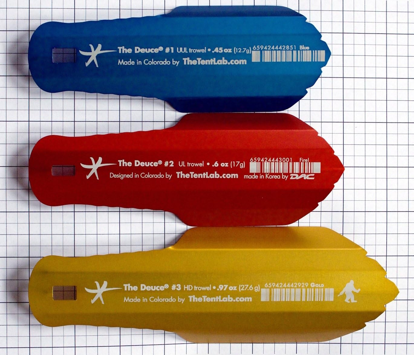 The Deuceof Spades(tm) Ultralight Backpacking Trowel is made in three models – each different in thickness, size and weight – but all are crazy-lightweight and made of extremely strong US-made aerospace grade 7075-T6 aluminum (strength that also allows tumbling and deburring, BTW). SIZE #1 – .45oz – 6.5″x2.4″ – for EXTREME weight fanatics ONLY – those willing to work with the ins and outs of their gear to get the most out of it (be sure to see the directions in the photo section). SIZE #2 – .60oz – 6.8″x2.5″ – The Backpacker’s favorite version nicely straddles the line between weight fanaticism (.6 ounces – POINT six ounces!) and comfort. The original groundbreaking *ahem* trowel that was the first in the world that made for using upside down for probingand prying (see Advanced Techniques photo above). SIZE #3 – .97oz – 8″x2.6″ – our full-sized trowel – bigger and stronger, a real beast that digs and prys easily, fast and comfortably – even in difficult rocky ground. Yet it weighs UNDER an ounce – a fraction of what other full sized trowels weigh. About our Manufacturing Please note that some Deuces are made in the US and some are made in Korea by DAC (the premier tent pole maker in the world). The quality and lifetime guarantee is exactly the same regardless of where your Deuce is manufactured. A quick glance at the photo or the color name will tell you where that exact model/color you’ve selected is manufactured.